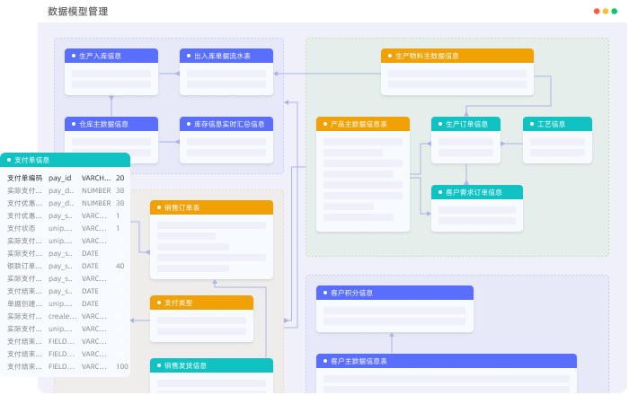 数据模型管理 在线模型可视化设计,通过数据模型设计、管控、引标、落标等治理能力,规范数据开发流程,夯实数据治理第一步。 可视化模型设计 内置丰富模板库 20+种数据库适配 智能数据标准落标