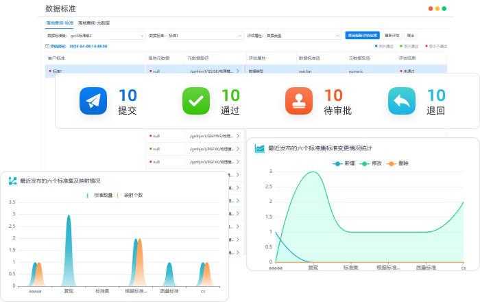 数据标准管理 提供全场景标准管理流程及办法,构建企业统一数据语言,并为元数据集中落标与治理、标准化数据建模提供约束依据,从源头保障数据的标准化生产。 内置行业标准模板 数据标准智能推荐 智能落标成果评估 一键生成质量规则