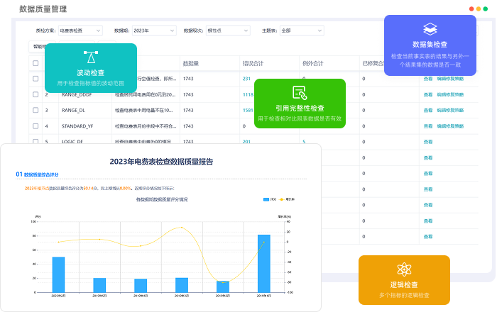数据质量管理 将质量规则管理、质量作业检核、质量问题报告等环节进行流程整合,实现质量问题的自动跟进,推动PDCA持续清洁形成完整的质量体系闭环。 内置质量规则库 基于大数据引擎的亿级质检 问题数据主动修复 数据问题量化评估
