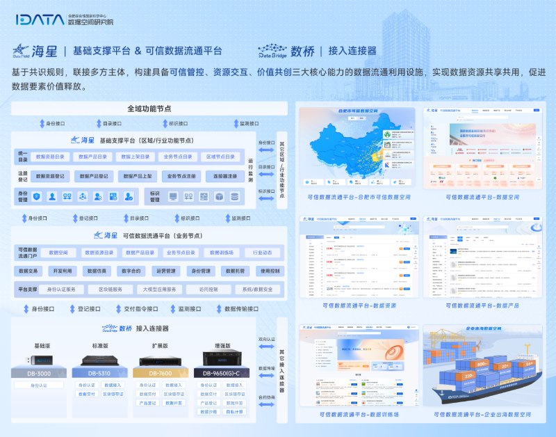 按照国家数据基础设施建设先行先试和数据要素试验区“双任务”要求,数据空间研究院创新构建了技术和制度融合型可信数据空间。在贯彻系列国家技术标准基础上,突破数据使用控制、隐私计算、语义统一等关键技术,细化医疗健康等行业分类分级、数据脱敏、衍生数据认定等细则,实现“技术+制度”双轮驱动,保障数据安全可信、合规高效地流通利用。通过纵向和横向数据的互联互通,实现“一点接入、全国互联”,集聚全国数据主体“供数据、用数据”,打造全国数据集散中心。实践中聚焦合肥“6+5+X”特色产业,面向15类场景上架了企业出海等6大行业数据空间,发布了43款数据产品,初步形成“产业引领+特色牵引+生态吸引”的数据流通利用格局,驱动数据库存变产能。